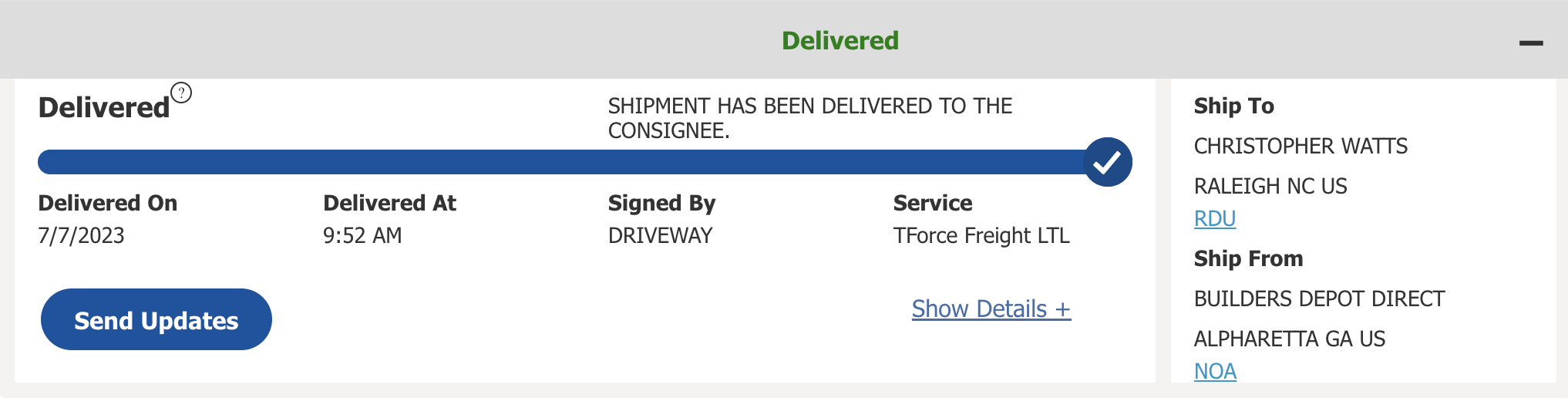My order was placed and received on Saturday, July 1st, 2023 and shipped out on Monday, July 3rd, 2023. The Builder Depot stayed true to the following claim on their page: “Orders ship out on an average of 1-2 Business Days of receiving payment.” Additionally, as promised, a phone call was made to setup a delivery window. In my case, the delivery window truly didn’t matter since I would be at work.