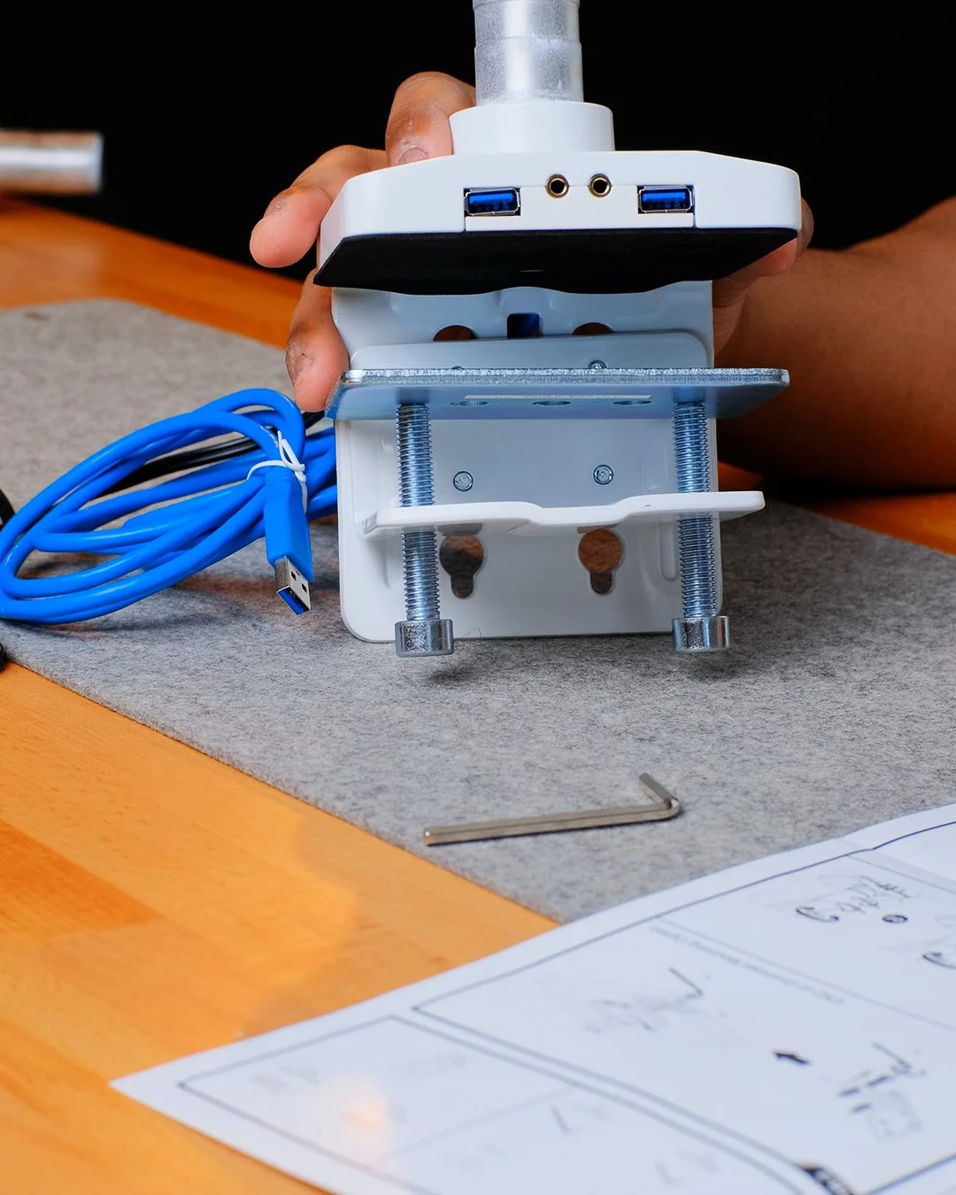 After clamping the C-clamp to my desk, the next step was to install both monitor arms.