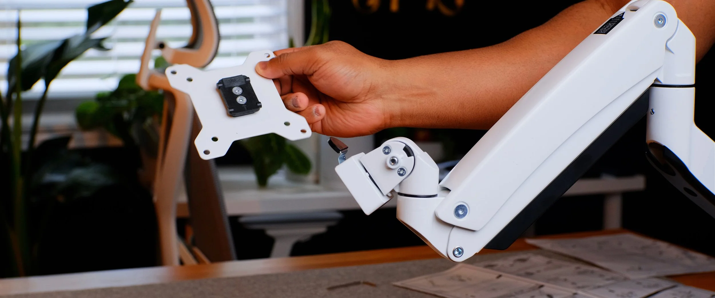 The aesthetic factor was the first requirement the AVLT Single 13"-43" Monitor Arm Desk Mount met for me. The contrast of a white monitor arm against the black wall is beautiful.