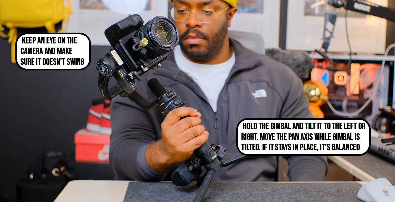 While holding the base of the gimbal, tilt the gimbal to the left or right and observe if the pan axis stays still OR if the camera swings in the direction you tilt it. If the camera quickly swings in the tilted direction, a sizable adjustment is needed in the opposite direction.
